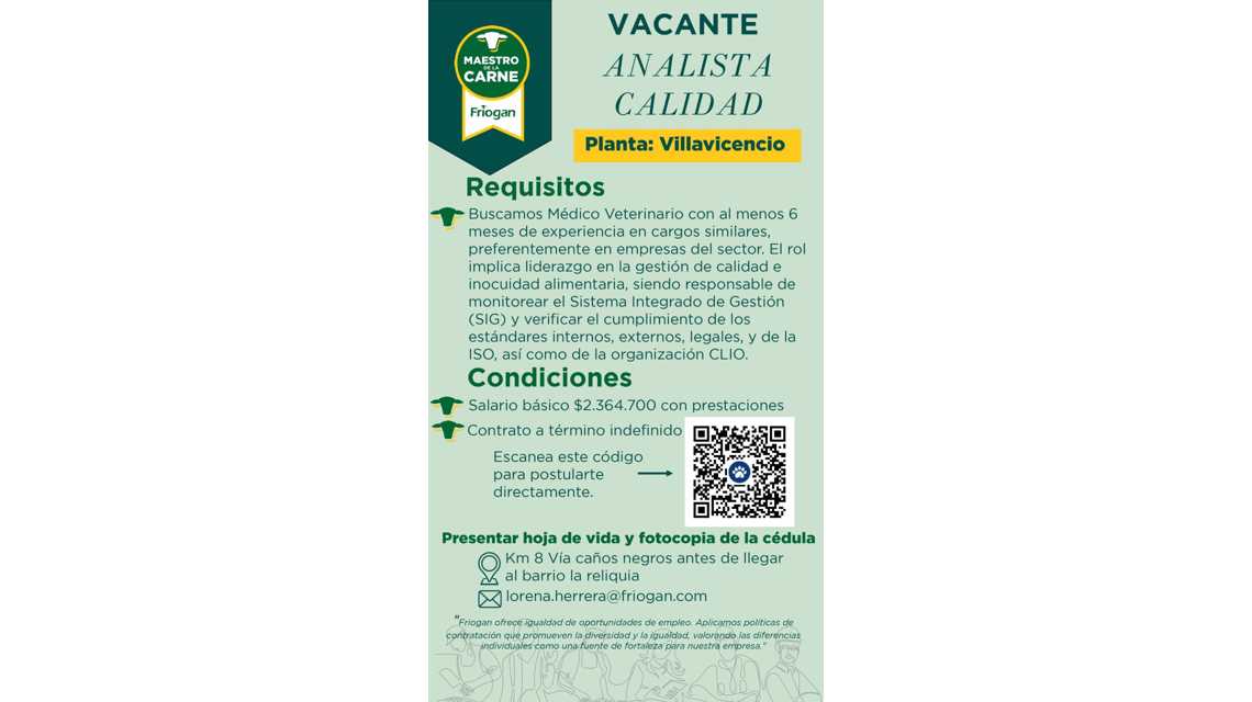Buscamos Médico Veterinario con experiencia mínima de 6 meses en cargos similares, preferiblemente en empresas del sector, cargos de liderazgo relacionados con los sistemas de gestión de calidad e inocuidad alimentaria. Encargado de realizar seguimiento al SIG mediante la verificación del cumplimiento de los estándares exigidos por el cliente interno como externo, legales, de la ISO y de la Organización – CLIO.