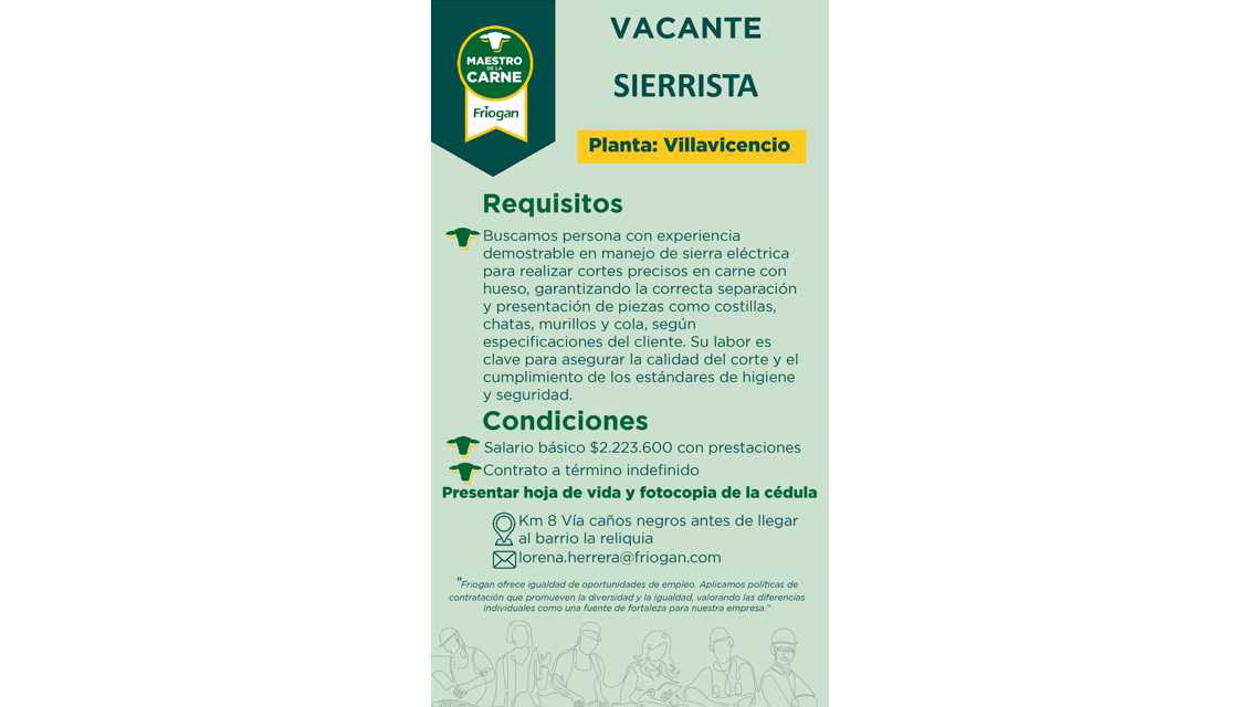 Buscamos persona con experiencia demostrable en manejo de sierra eléctrica para realizar cortes precisos en carne con hueso, garantizando la correcta separación y presentación de piezas como costillas, chatas, murillos y cola, según especificaciones del cliente. Su labor es clave para asegurar la calidad del corte y el cumplimiento de los estándares de higiene y seguridad.